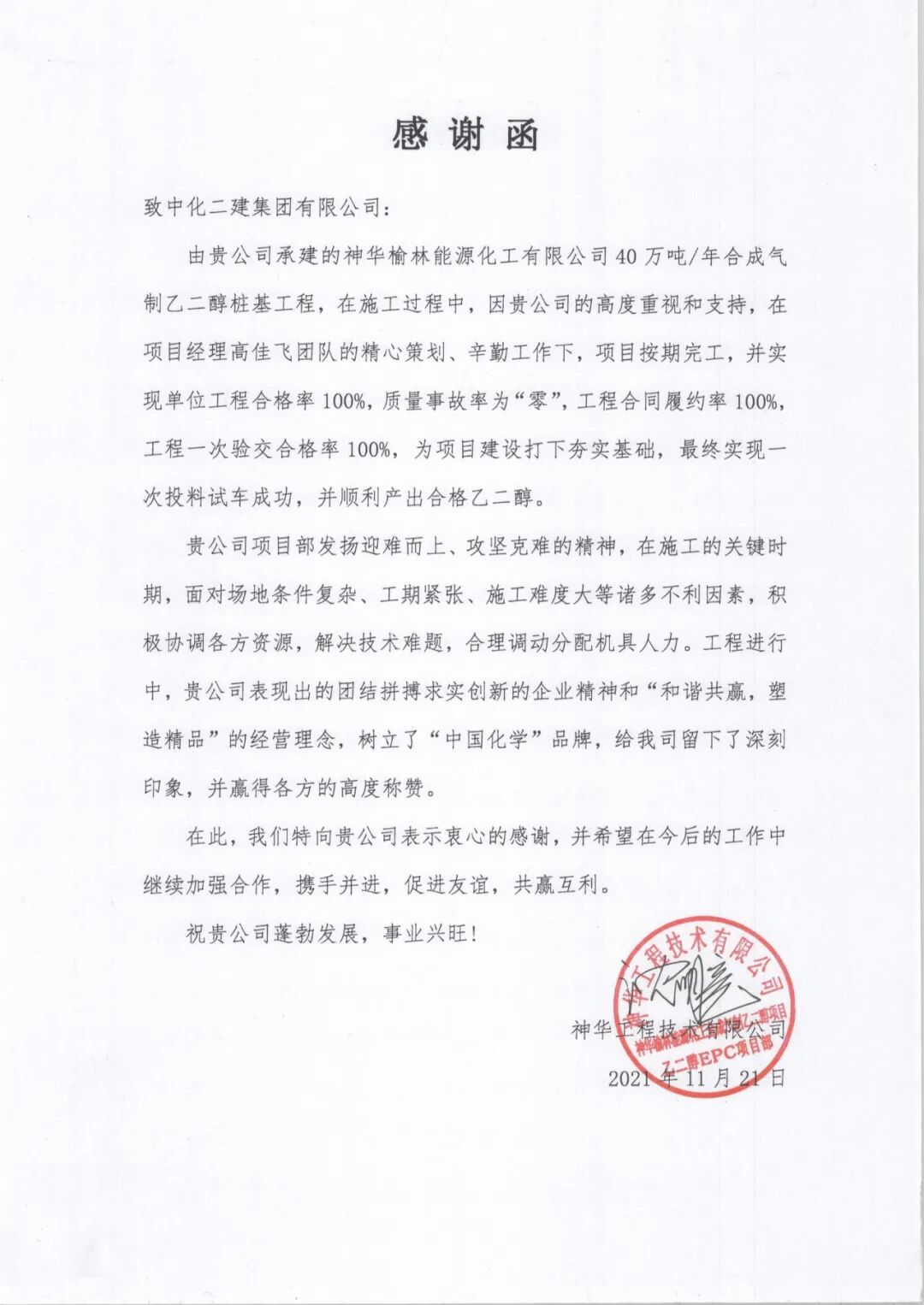 函中提到,由我公司承建的神华榆林能源化工有限公司40万吨/年合成气制乙二醇桩基工程,项目部面对地形条件复杂、工期紧张、施工难度大等各种不利因素,能合理调配机具人力,实现了单位工程合格率100%,质量事故率为零,工程合同履约率为100%,工程一次验交合格率100%,为项目建设夯实了基础,并希望在今后的工作中继续加强合作,携手并进,共赢互利!
